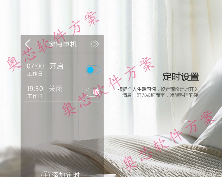 根據個人的生活習慣,設定窗簾定時開關。清晨,陽光如約而至,喚醒熟睡的你。